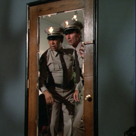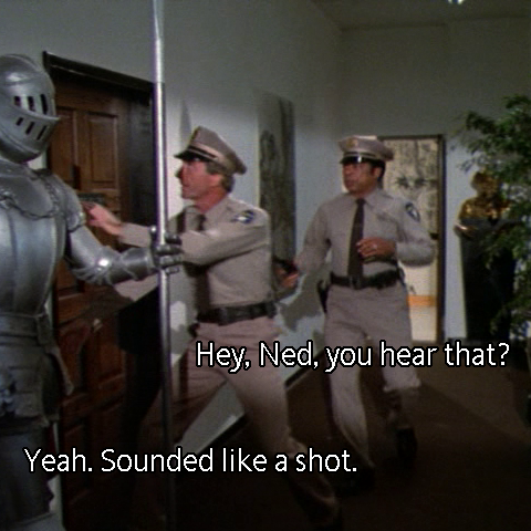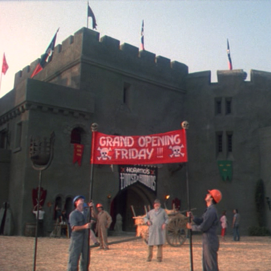 At 7:15 pm, a gunshot disturbs the after hours quiet at the House of Horrors. Security guards Ned and Nemo investigate, but are thwarted by Horatio’s bolted door.