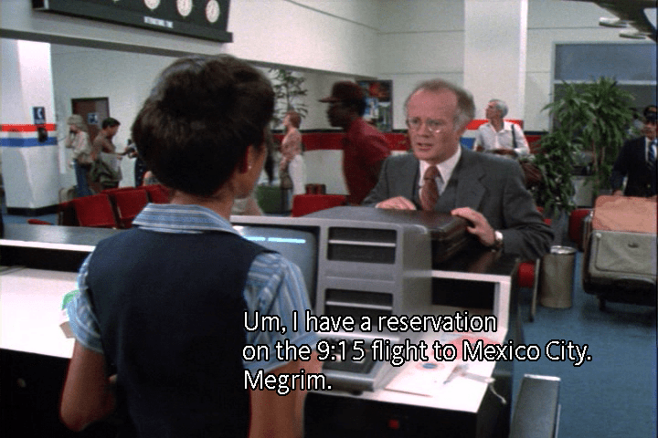 We are misdirected back to the airport, where a panicked and flustered Arnold Megrim just wants to escape – to Mexico City, to be exact.
