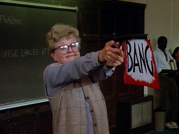 We see two sides of Jessica this episode. Aunt Jess is in town for personal reasons, spending quality time with her niece’s family. A model guest, she can fix bicycles andburgers for dinner! However, it’s J.B. Fletcher, the sought-after novelist, who finds herself mixed up in yet another colorful murder.