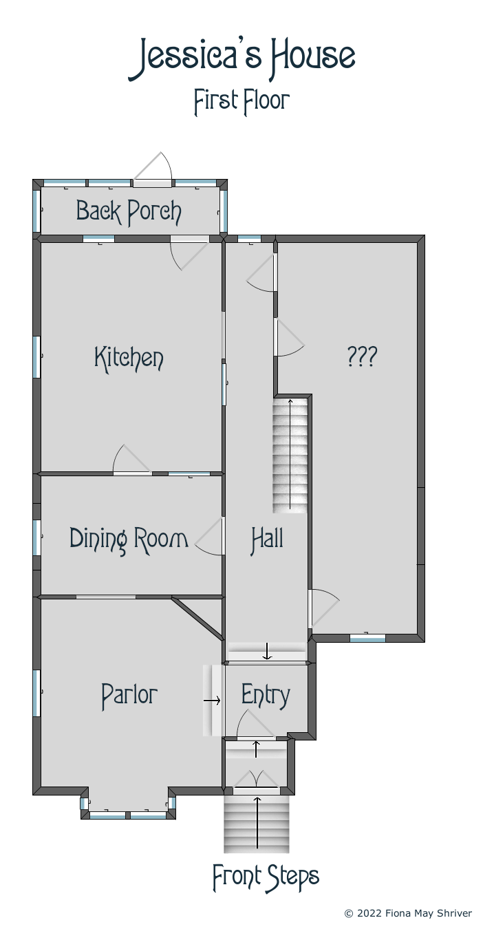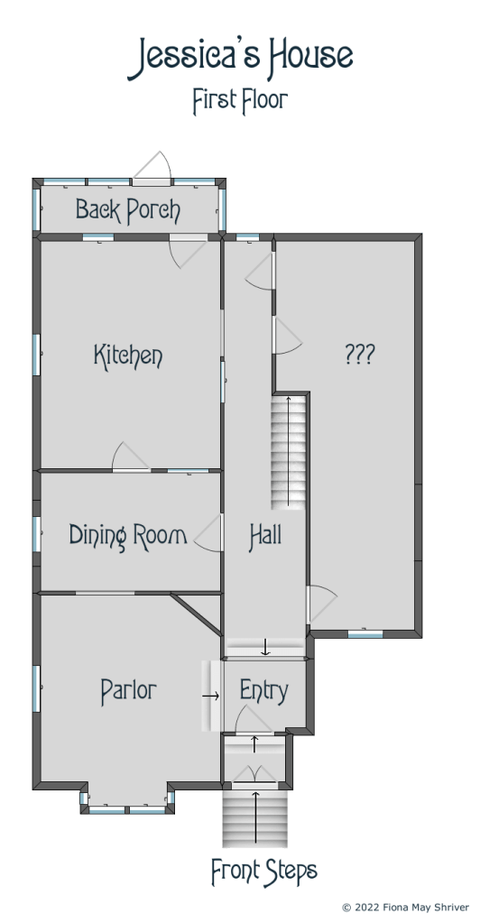 Many of the scenes in the second episode of the series, “Deadly Lady,” were set in and around Jessica’s house. I’ve started working on a floor plan based on the exterior and interior shots so far presented. As the MSWSW project progresses, I’ll continue to build out the floor plan and add in more details.