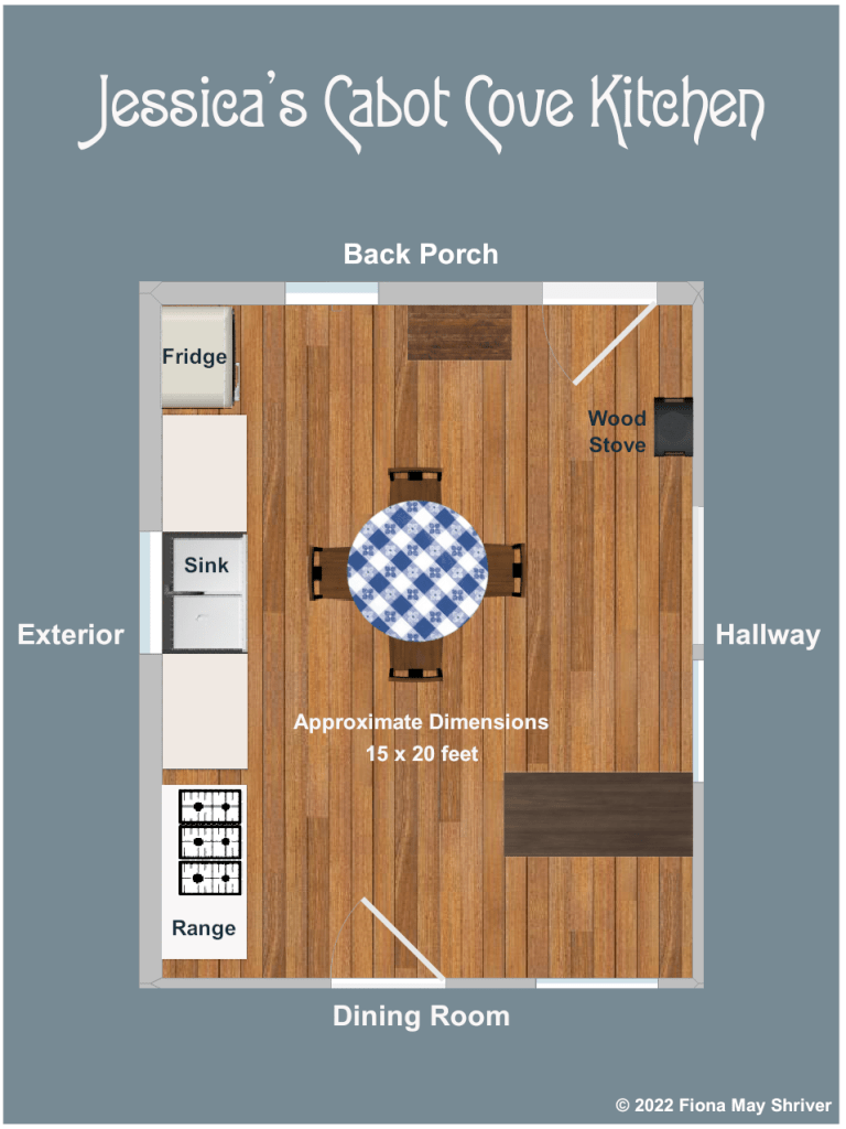 Jessica’s kitchen is truly the heart of her home in Cabot Cove. It’s far and away the room that appears most frequently, and it’s the room in which we see her typewriter, so we can imagine the many hours she spends in her kitchen writing.