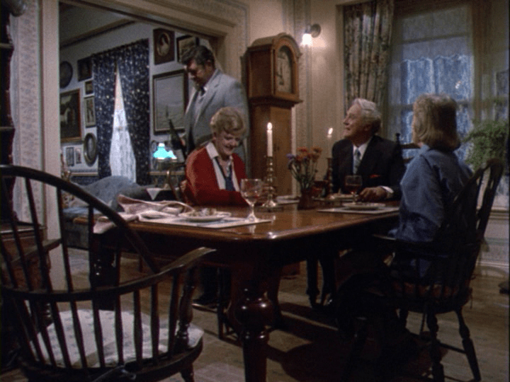 Jessica’s dining room is modest in size, and a pass through from the kitchen to the parlor. In S1 E7: “Hit, Run and Homicide”, one of Jessica’s dinner parties offers a detailed look at the dining room: