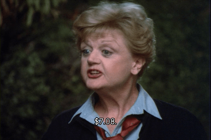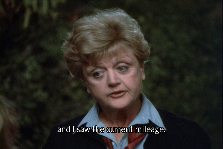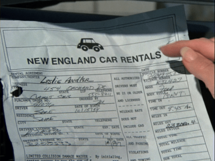 So, on its face, the $7.08 fill-up is totally plausible. And that’s assuming Leslie never got gas in Portland before heading back to Cabot Cove. Well, never mind. What’s important is that the pitstop inspires Jessica to snoop in the glove compartment for the car rental agreement.