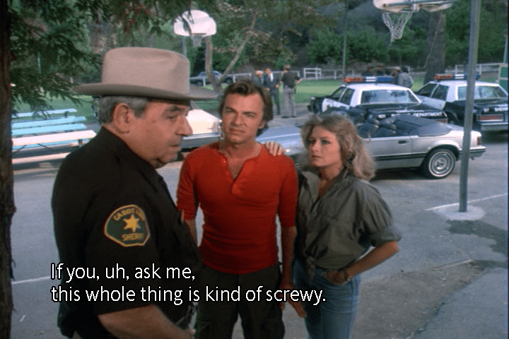 First, how did law enforcement find the red and gray van? And in finding it, certainly its location, registration, plates, VIN, etc. would be important, and possibly conclusive, evidence as to who killed Dean Merrill. So important and conclusive, the whole reenactment might not even have been necessary. While we’re on the subject, those same identifying features (registration, plates, VIN) for the station wagon would also probably be edifying. And if not, we the audience should be told why not.